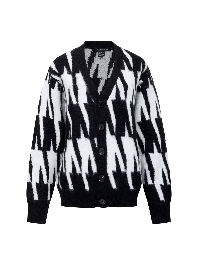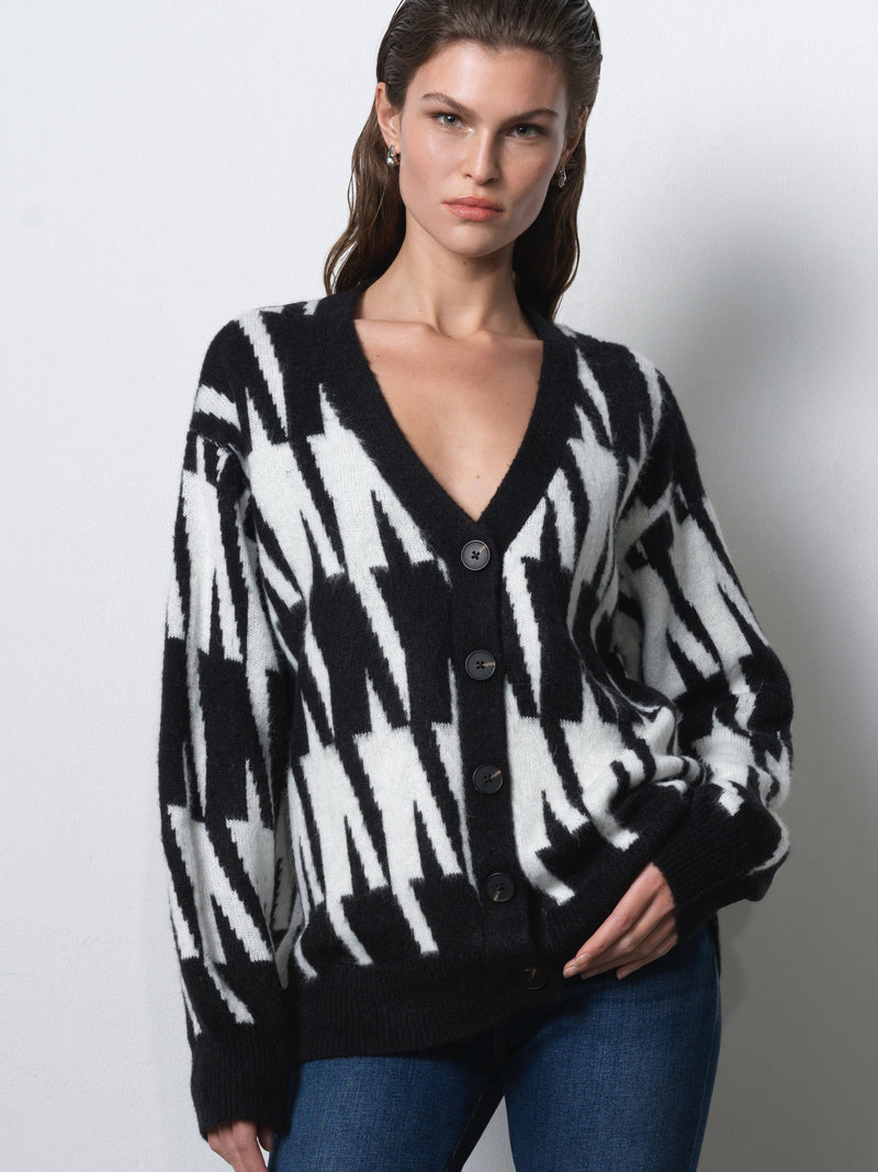 Cosy meets contrast. Our statement Hadlee Jessika Cardigan features a brushed knit finish, striking geometric pattern and classic button-through design.