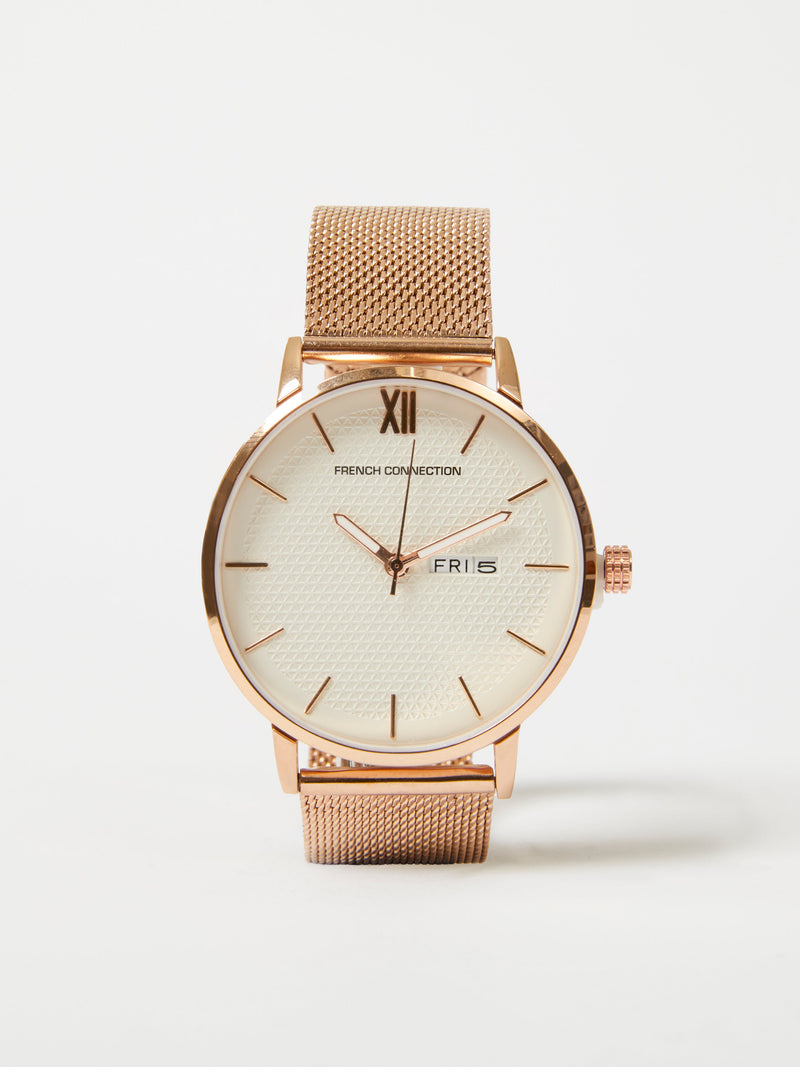 Would you look at the time? It's chic-o-clock. Our Rose Gold Tone Mesh Bracelet Watch with White Dial is set to compliment every outfit, from day to night, and provide functionality with a luxe rose gold tone case hosting a clean white dial with three hands, day & date apertures and French Connection branding, all whilst gracing your wrist with a co-ordinating mesh bracelet.