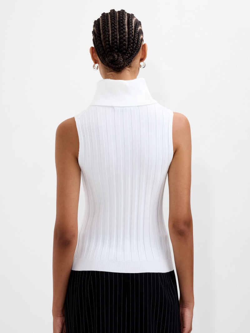 Modern minimalism. Our Turtleneck Knitted Tank Sweater features a sleeveless silhouette with a sleek turtleneck, defined vertical rib, and soft stretch fit.