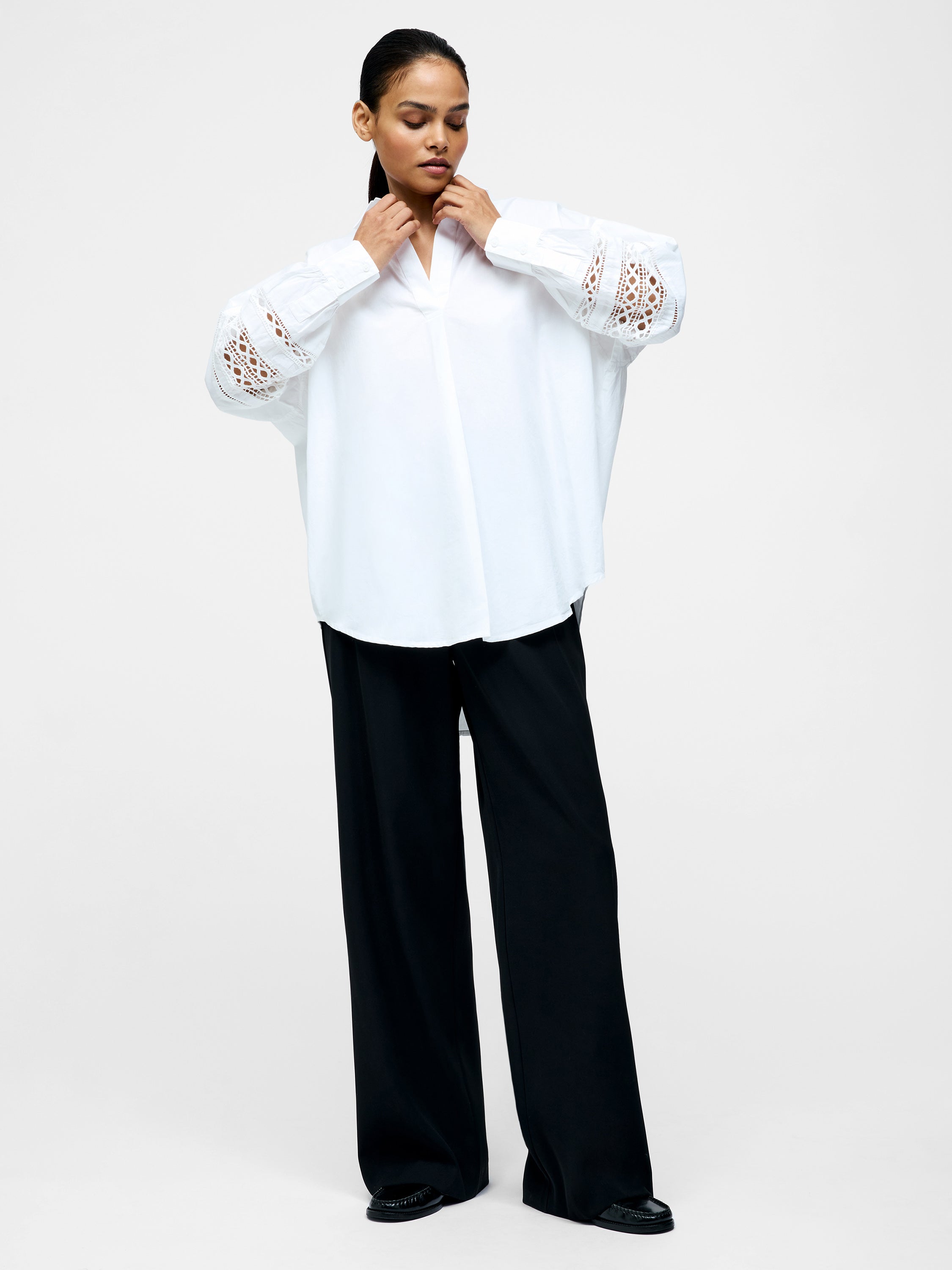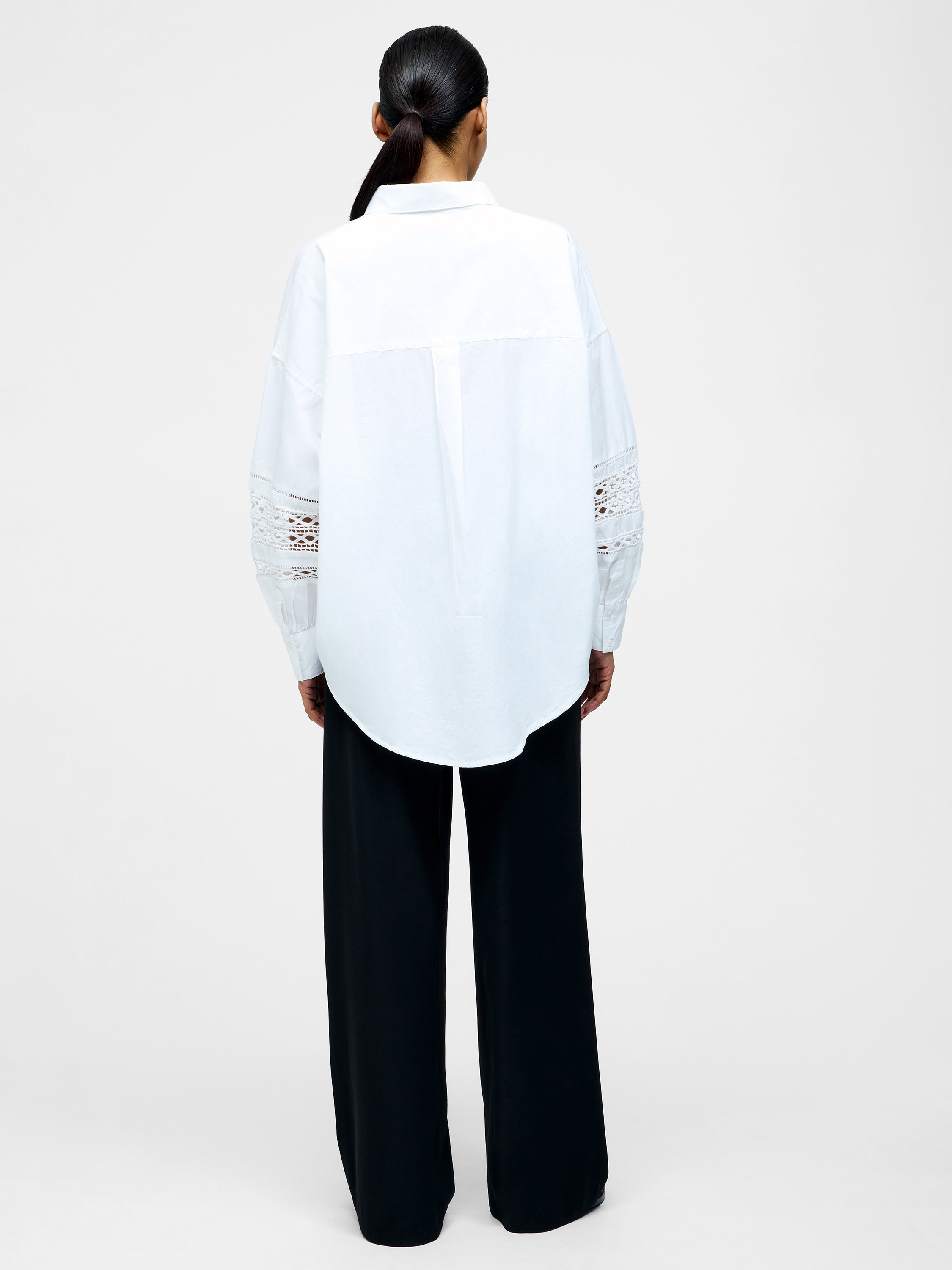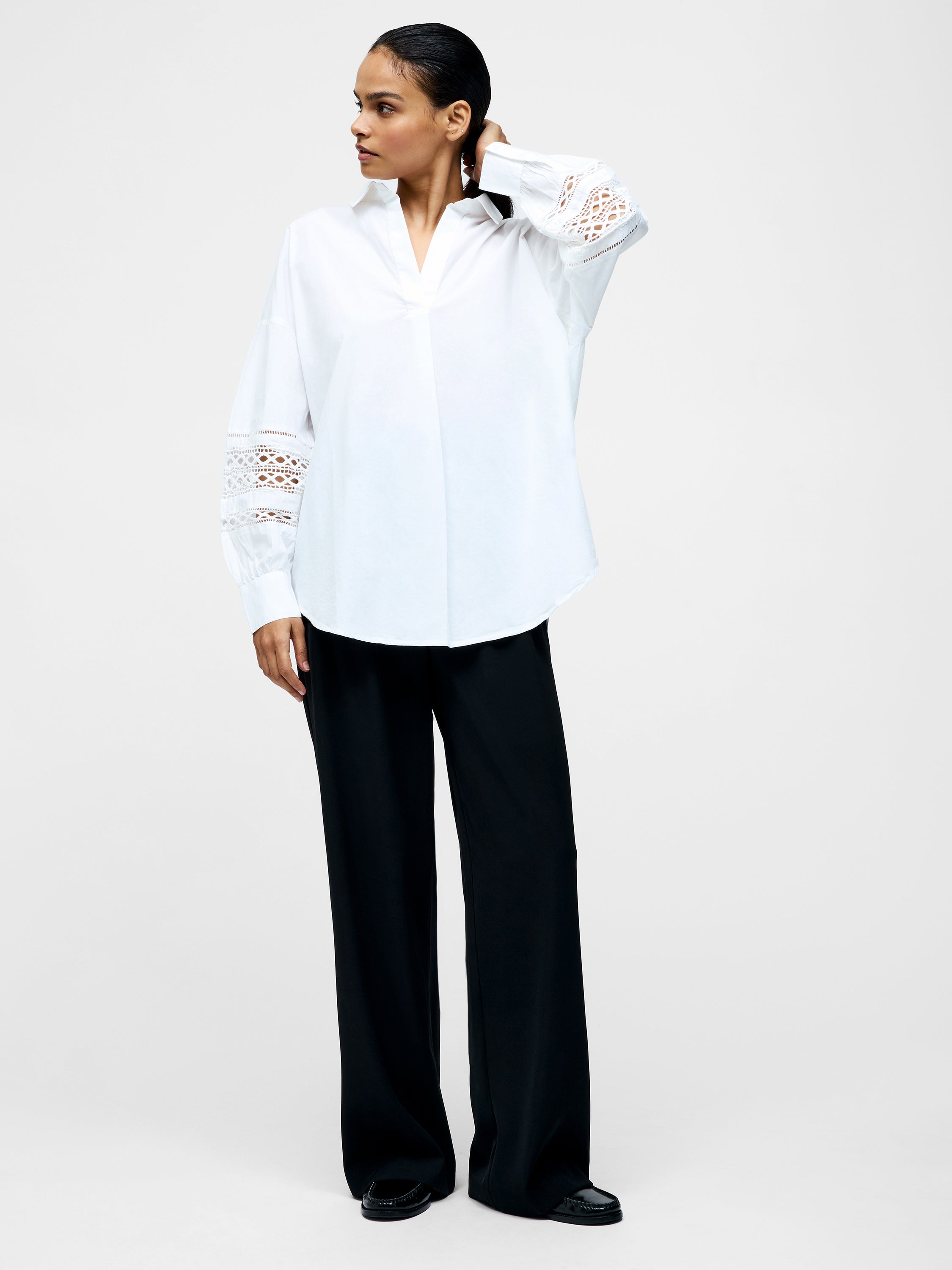 Crisp, clean and undeniably chic. Our Crochet Trim Poplin Long Sleeve Popover Shirt pairs a relaxed silhouette with a collar, v-neckline and crochet trimmed sleeves.