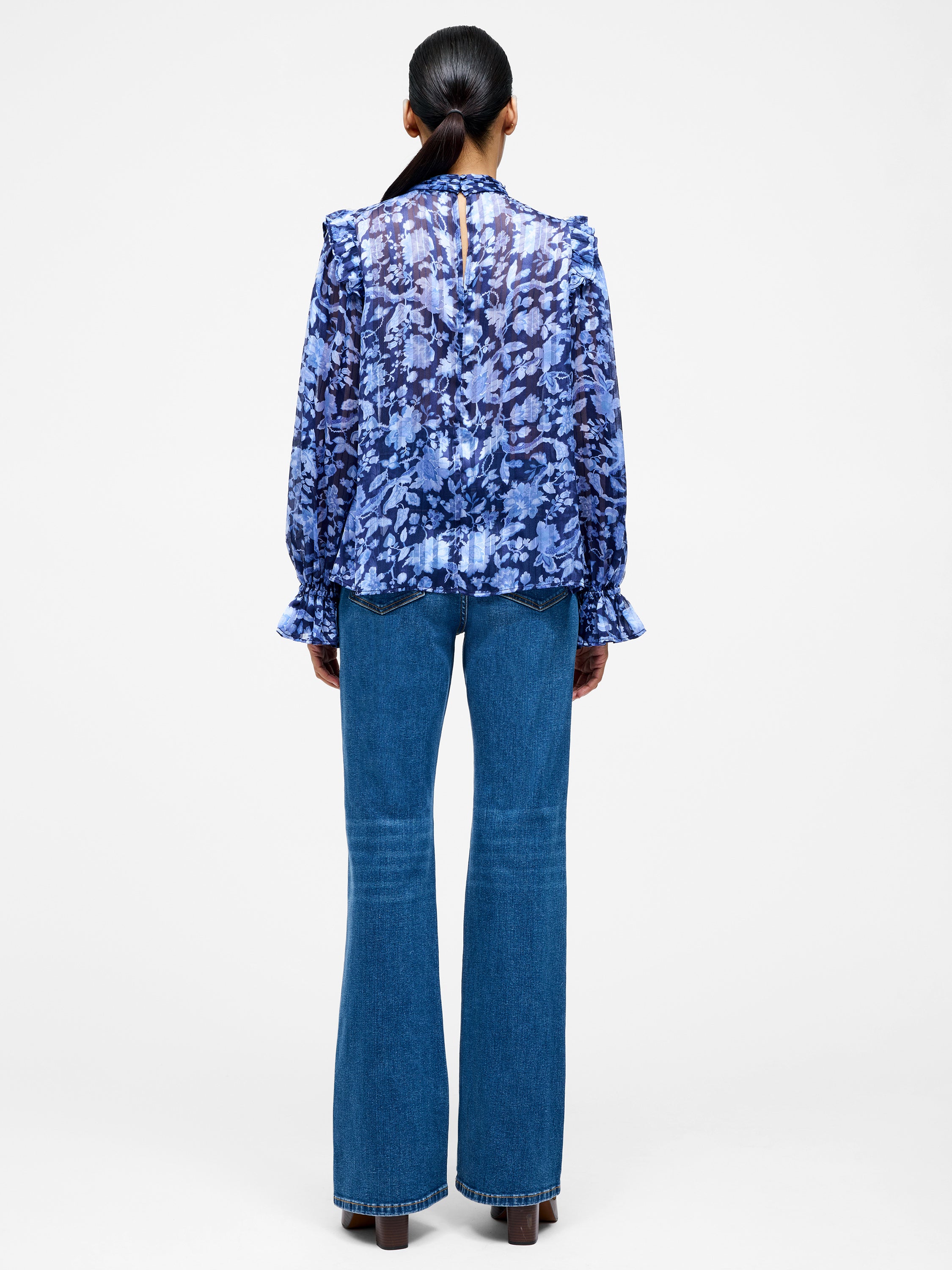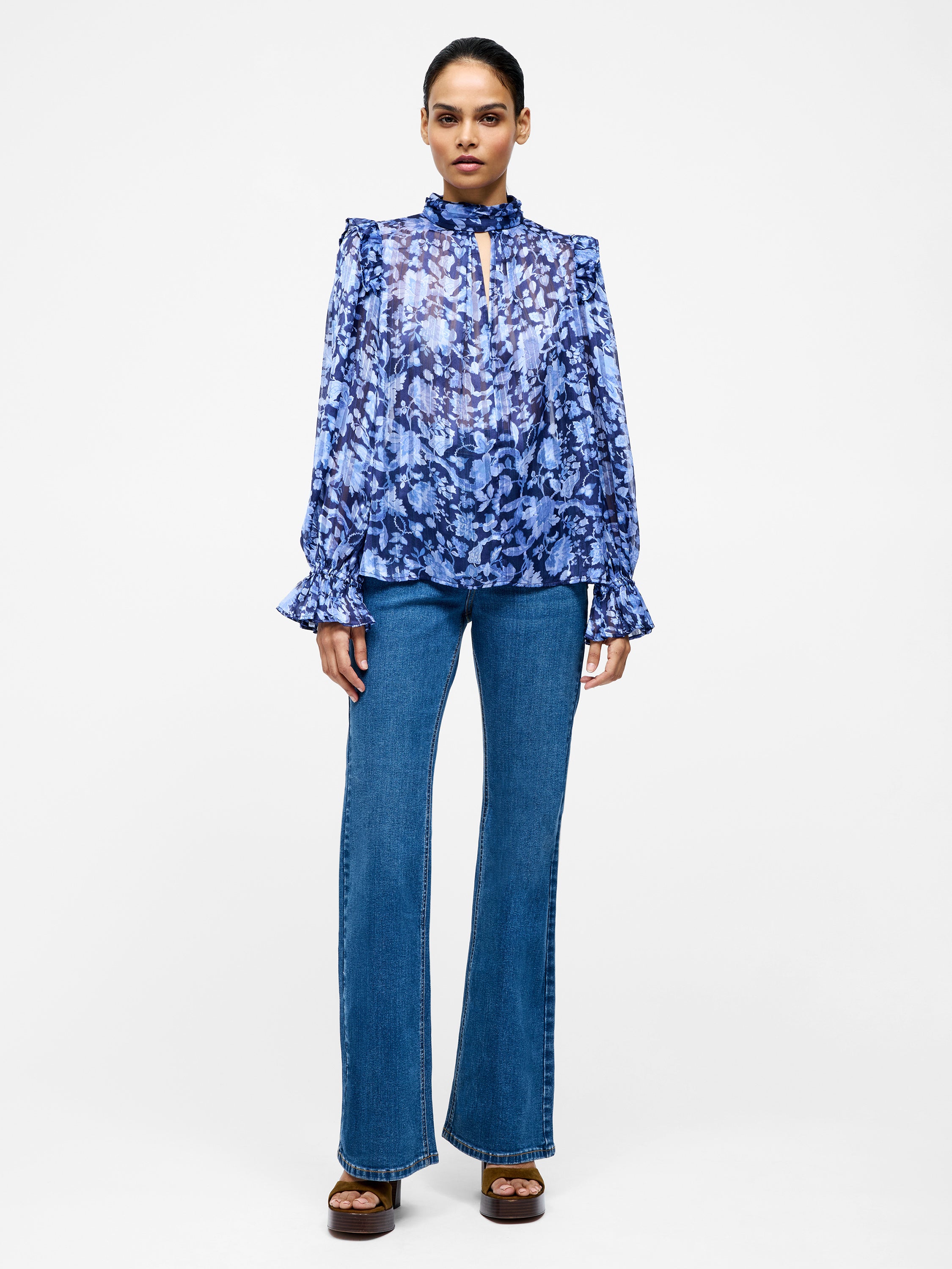 Our Cynthia Frill Long Sleeve Top is a floral favourite, and it's clear to see why. This semi-sheer top flourishes with a floral print, featuring a high neckline and long sleeved silhouette with modish keyhole cut-outs, pleated detailing and romantic frill trims.