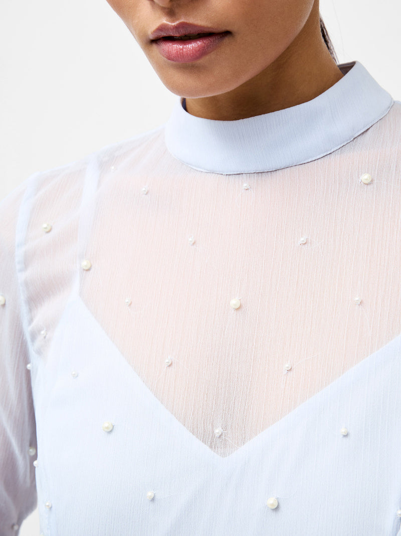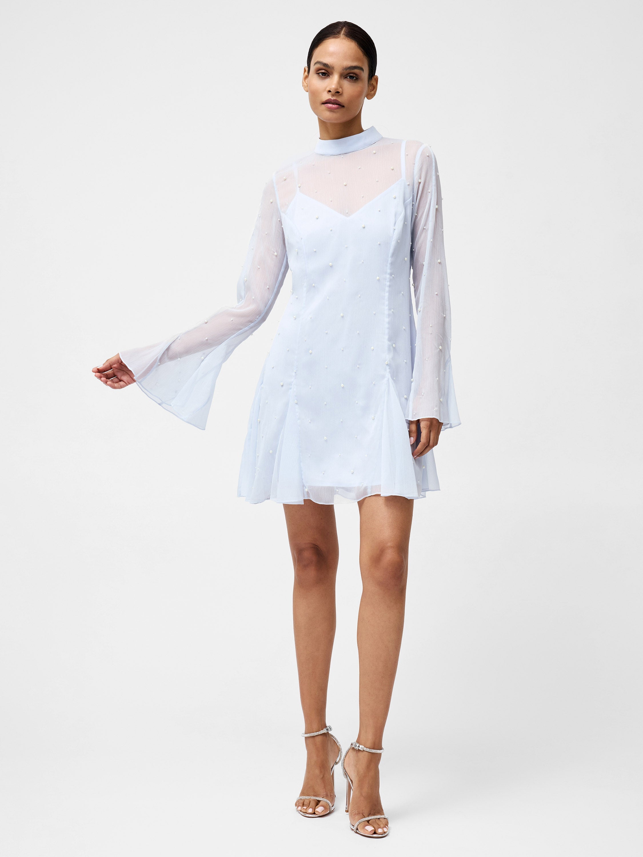 Our Elizabeth Chiffon Faux Pearl Dress embodies ethereal elegance. This powder blue dress features faux pearl embellishment across a semi-sheer silhouette with long flared sleeves, a mock neck and attached slip dress lining.