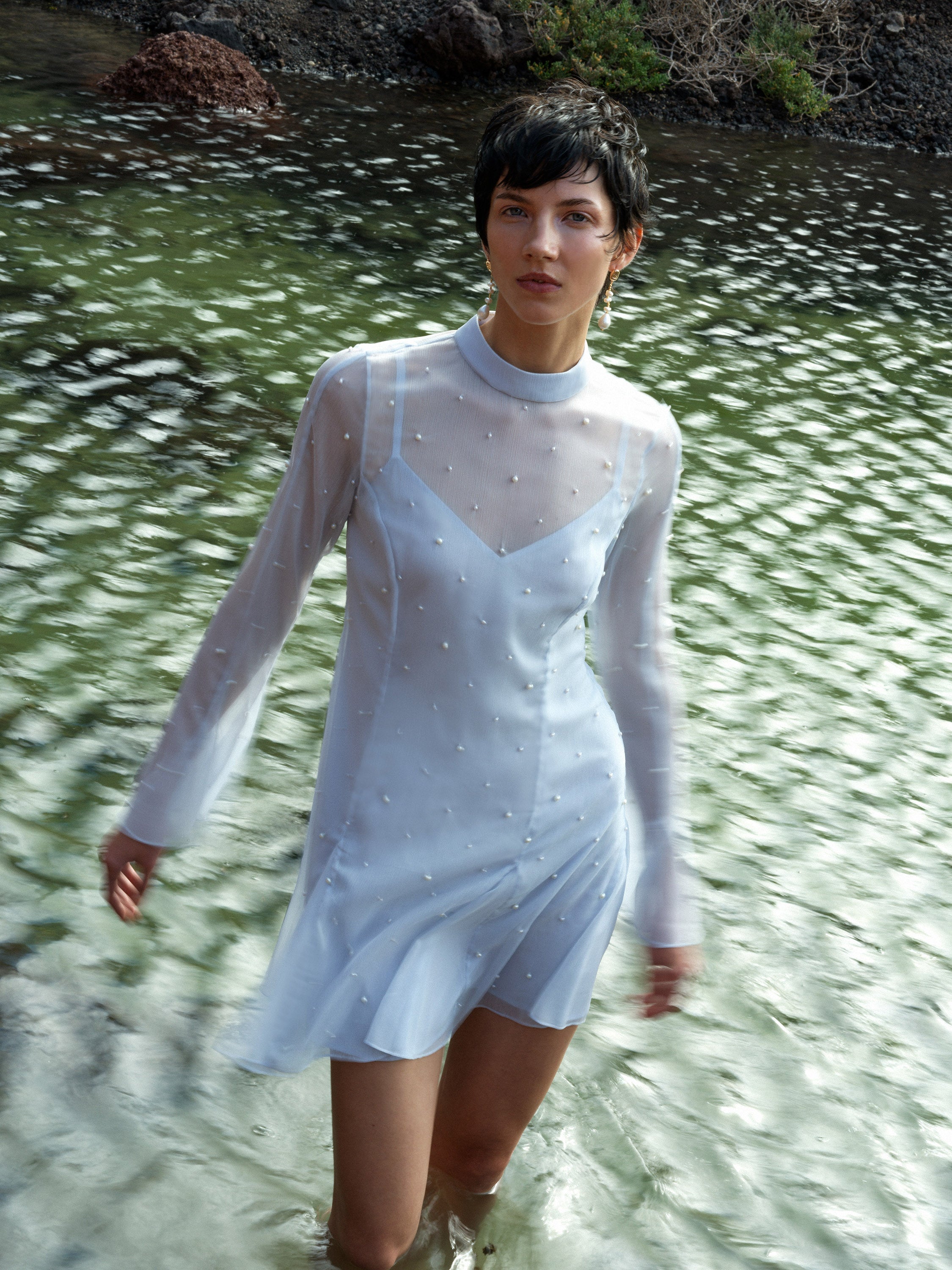Elizabeth Chiffon Faux Pearl Mini Dress
