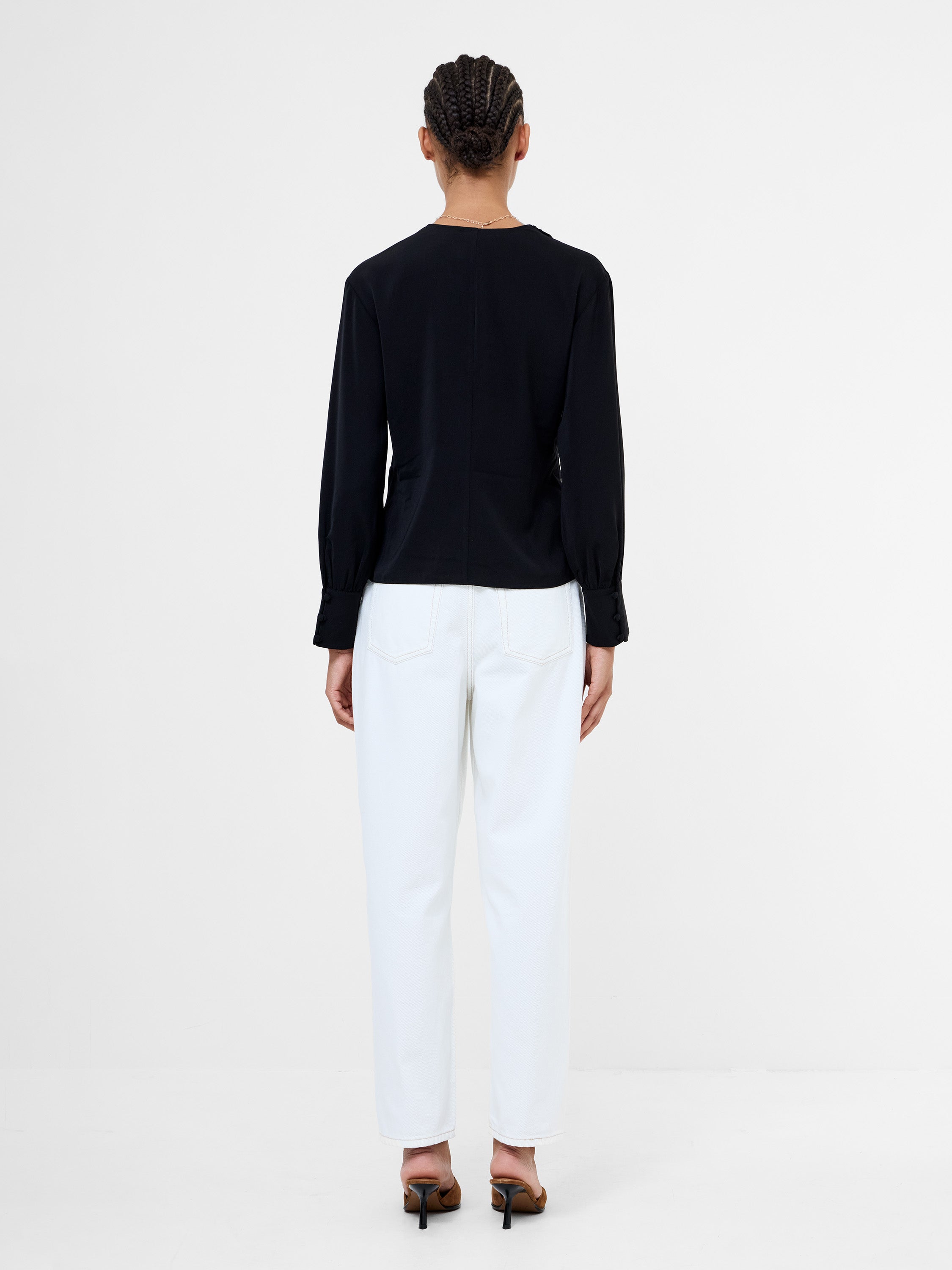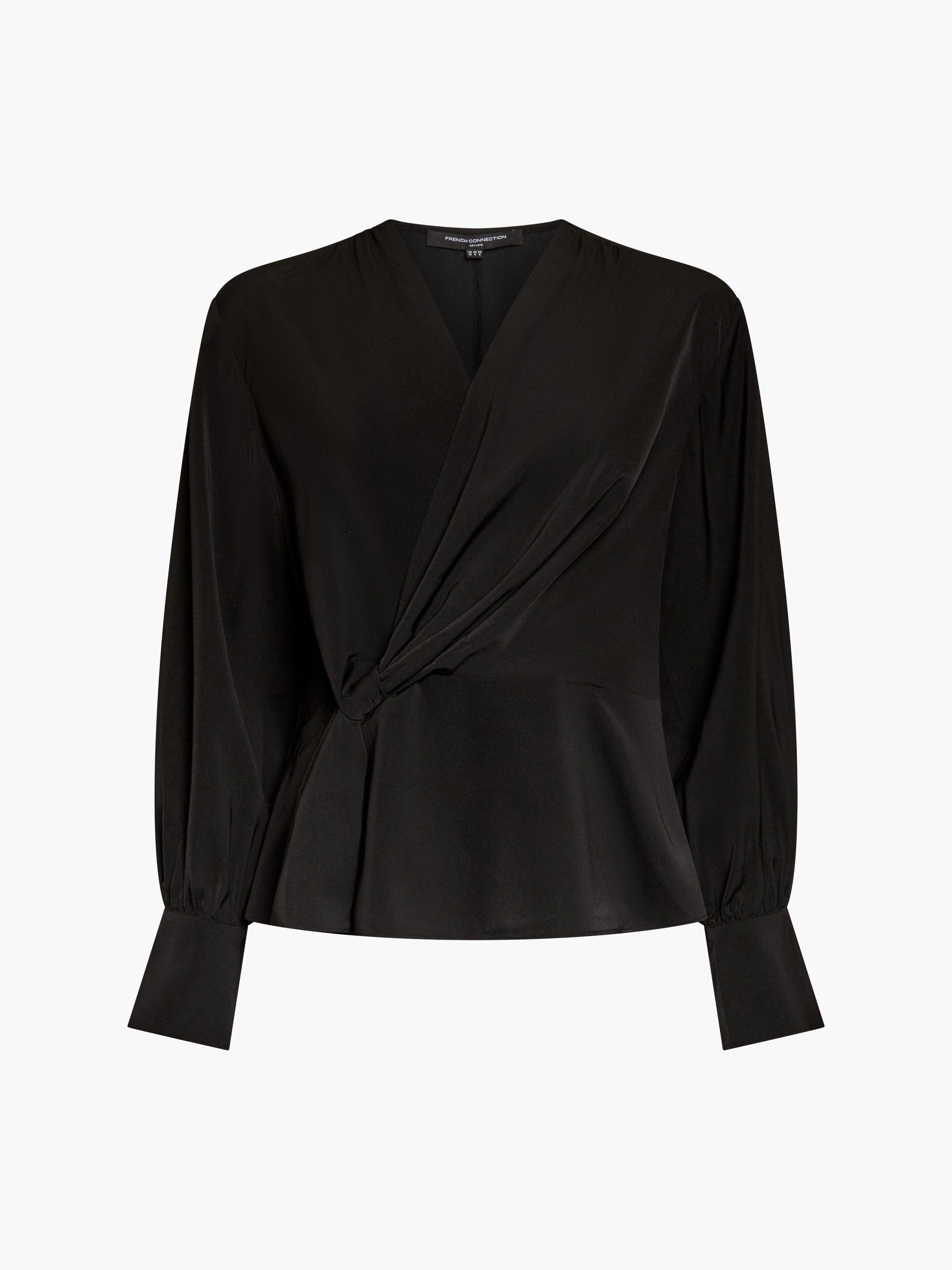 Our Laurel Crepe Wrap Peplum Top goes with the flow. This black top features a v-neckline with side tie detail, voluminous long sleeves and a flattering peplum hem.