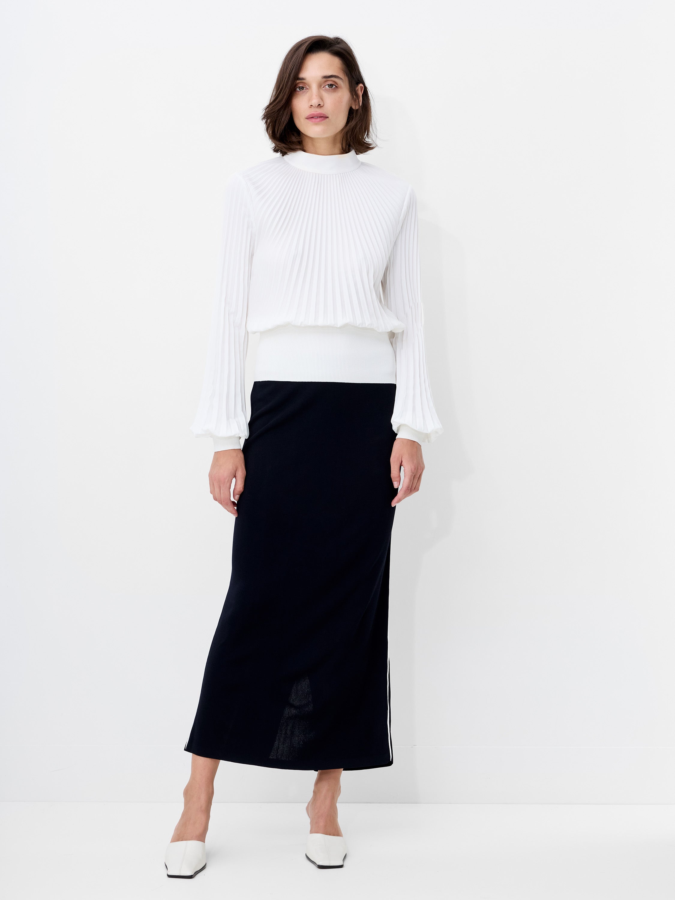 Pleats, please. Our Levy Balloon Sleeve Pleated Top features a mock neck, graceful balloon sleeves and flattering fitted hem.