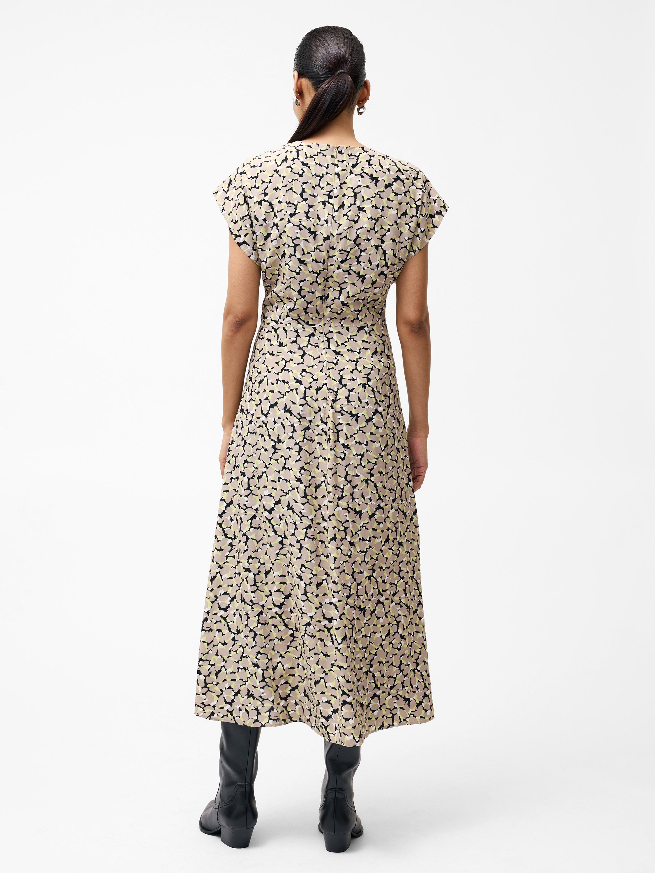 Seasonal sophistication, brought to you by our Lillian Eco Draped Front Midi Dress. This printed dress features draping across its midi length, a v-neckline and its whimsical print.