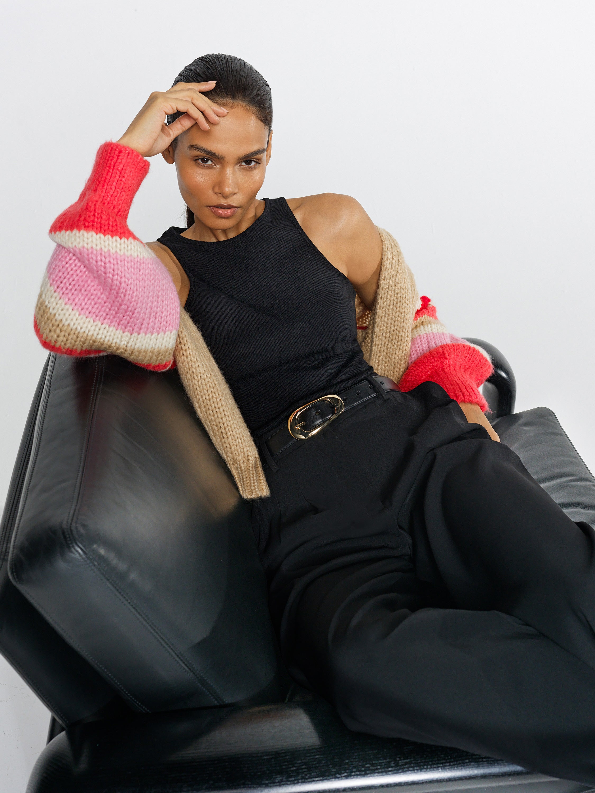 Cardigans don’t come much more cosy than our Monroe Stripe Long Sleeve V Neck Cardigan. This knitwear style has contrasting stripes upon its long sleeves, complementing its neutral toned body and ribbed hem.