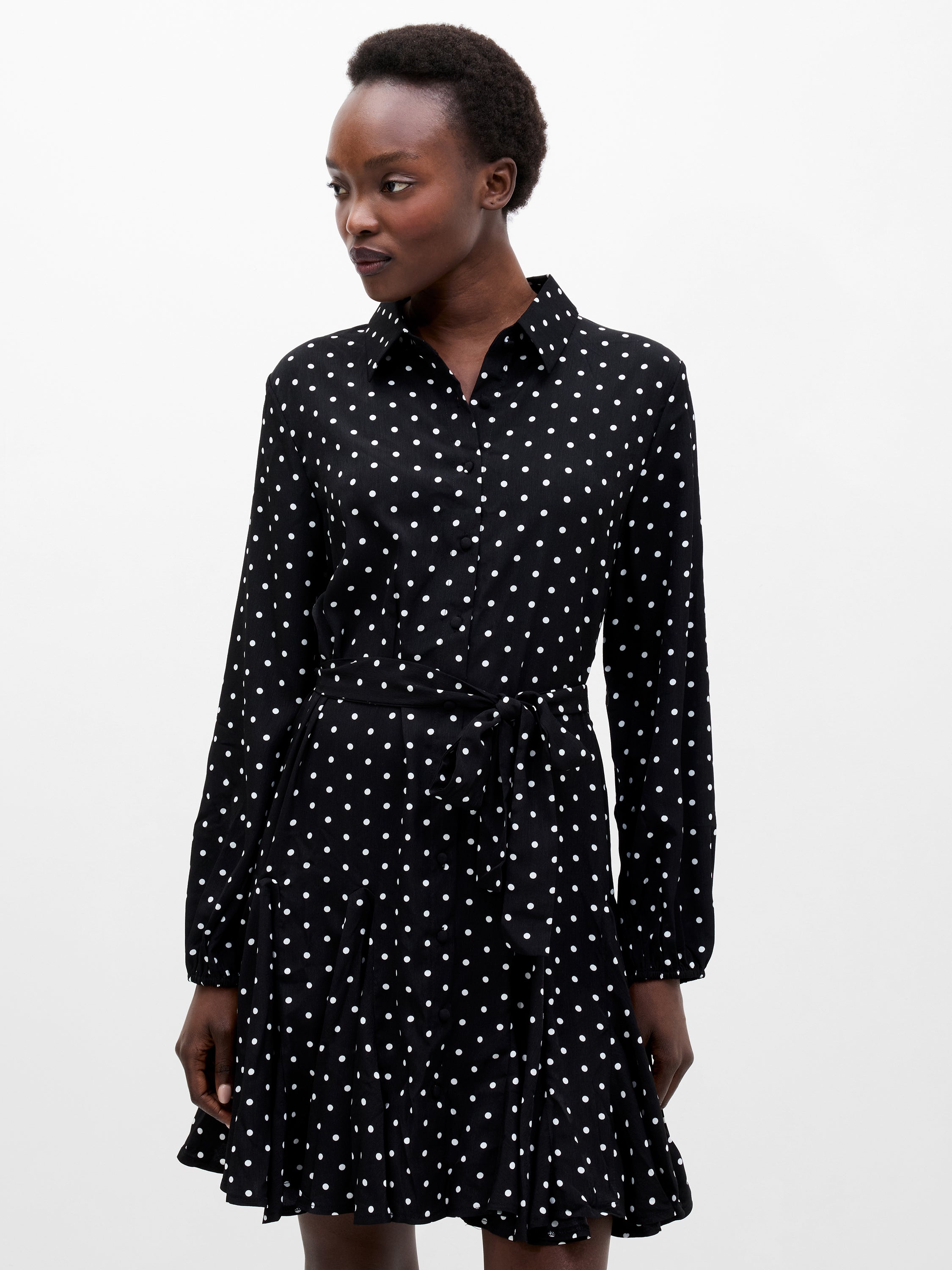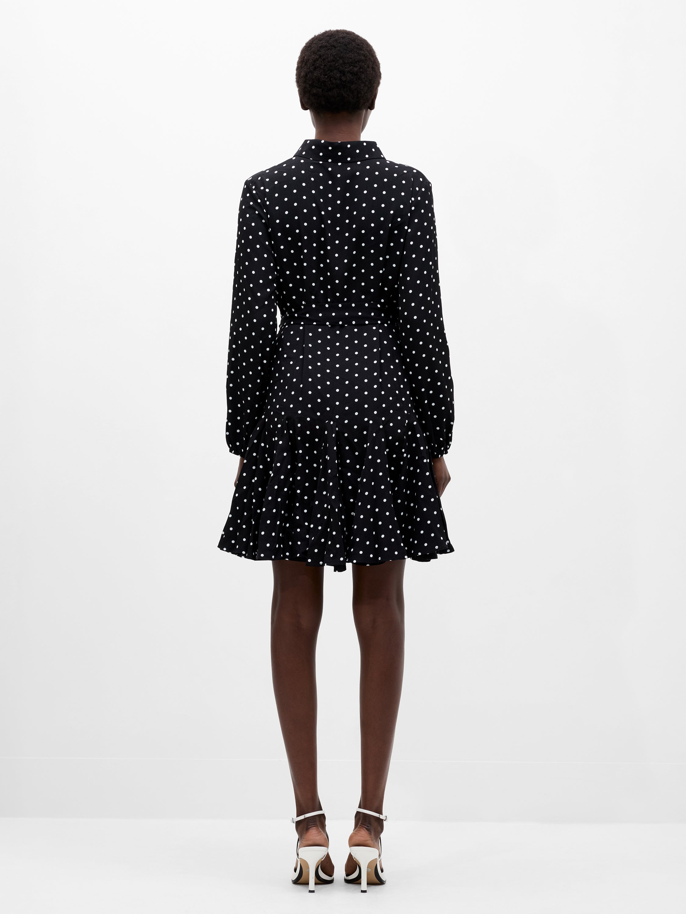 The print of the season. Our Polka Dot Swing Dress stars in monochrome polka dots, presenting a long puff sleeved silhouette complete with pointed collar, button down front, self-tie belt and flattering pleated skirt.