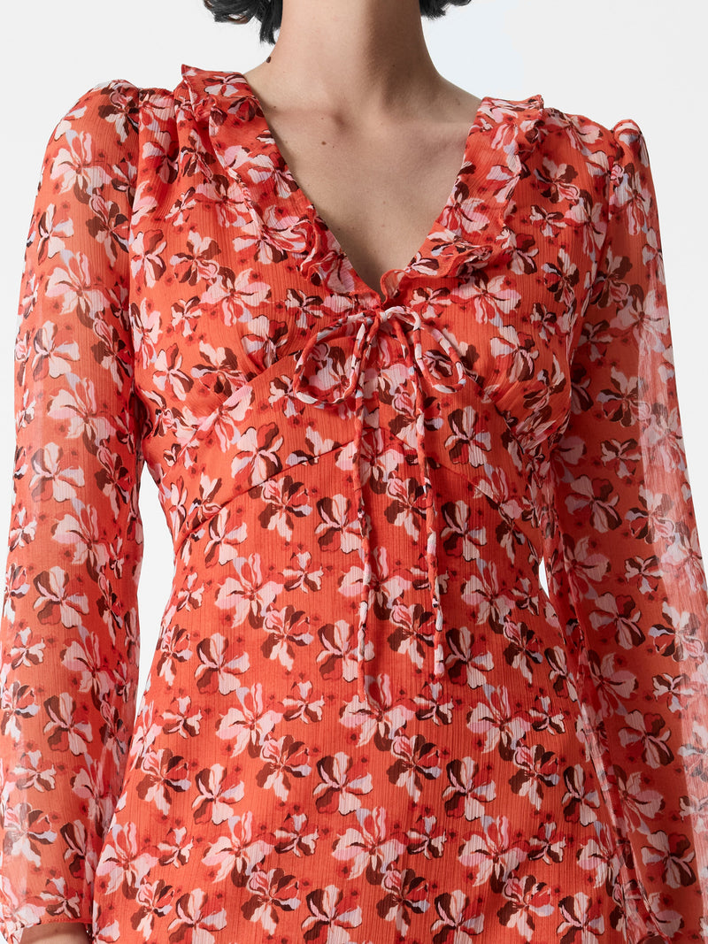 Bring the drama, keep the charm. Our floral Rebecca Emina V Neck Dress features delicate ruffles, an empire waist with bow detail and sheer long sleeves for a light, romantic finish.