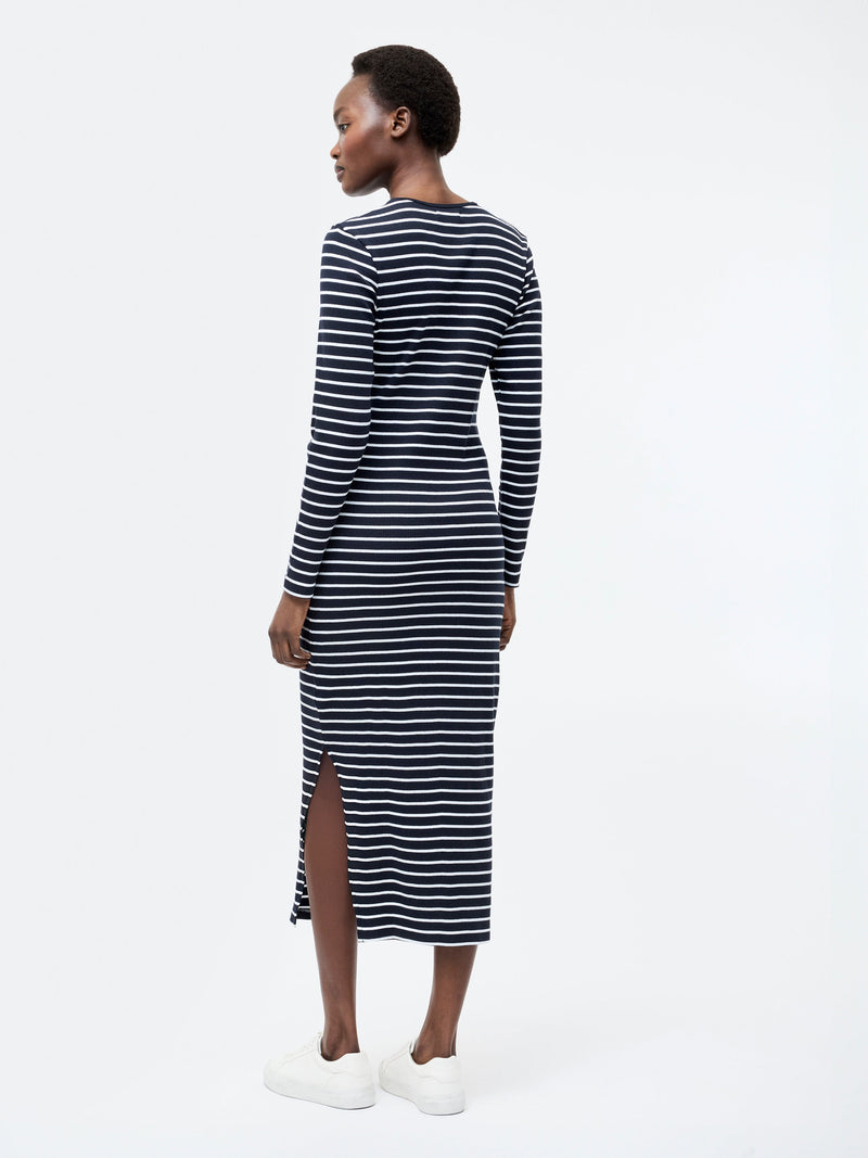 Our Ribbed Stripe Long Sleeve Midi Dress brings easy movement and modern flair to your wardrobe. In bold monochrome stripes, this midi dress features a ribbed texture with long sleeves and a side split.