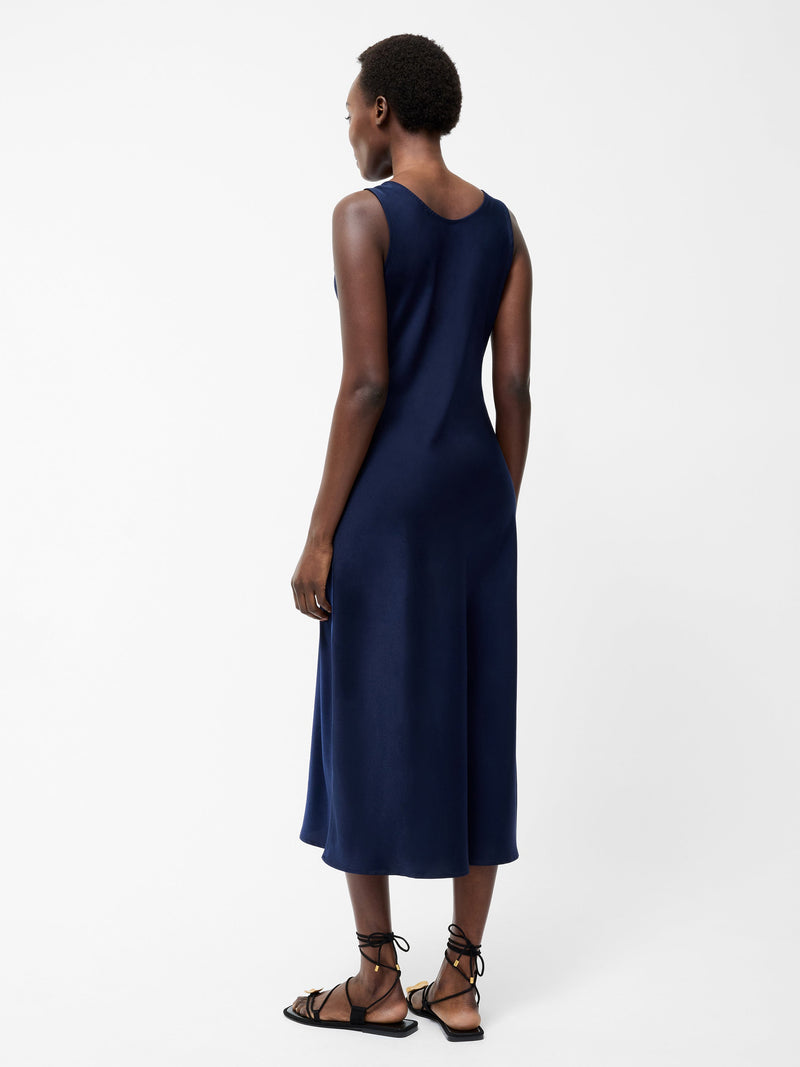 Our Scoop Satin Slip Dress is smooth, sultry and effortlessly elegant. Crafted from soft satin, this dark blue dress features a flattering scoop neckline, a sleek sleeveless design and a flowing midi-length silhouette.