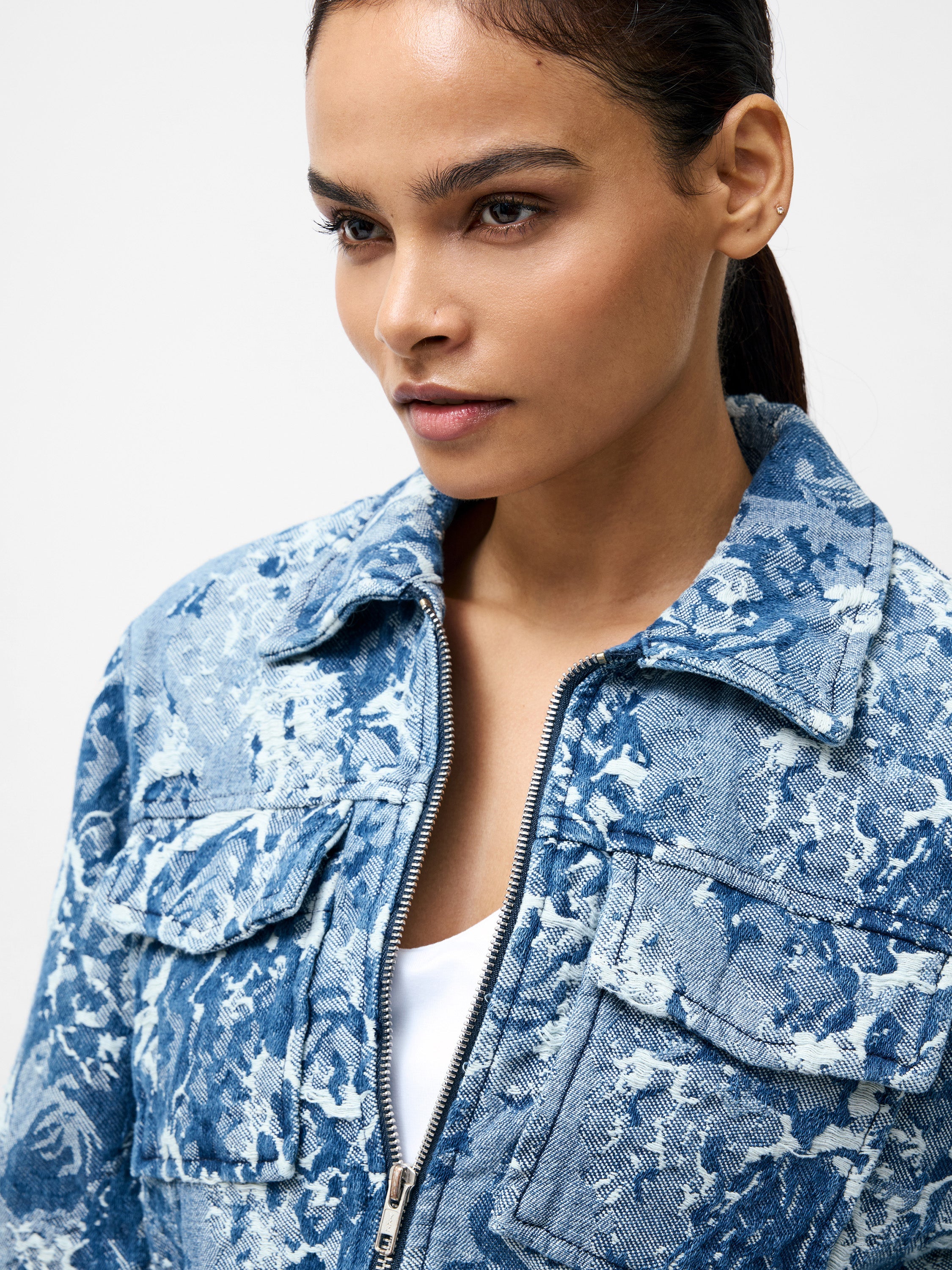 Up your denim game with our Charlotte Denim Jacquard Jacket. This trucker jacket combines its traditional collar and breast pocket with a modern zip-up fastening and bold blue-on-blue floral print for a functional meets fashionable outerwear style.