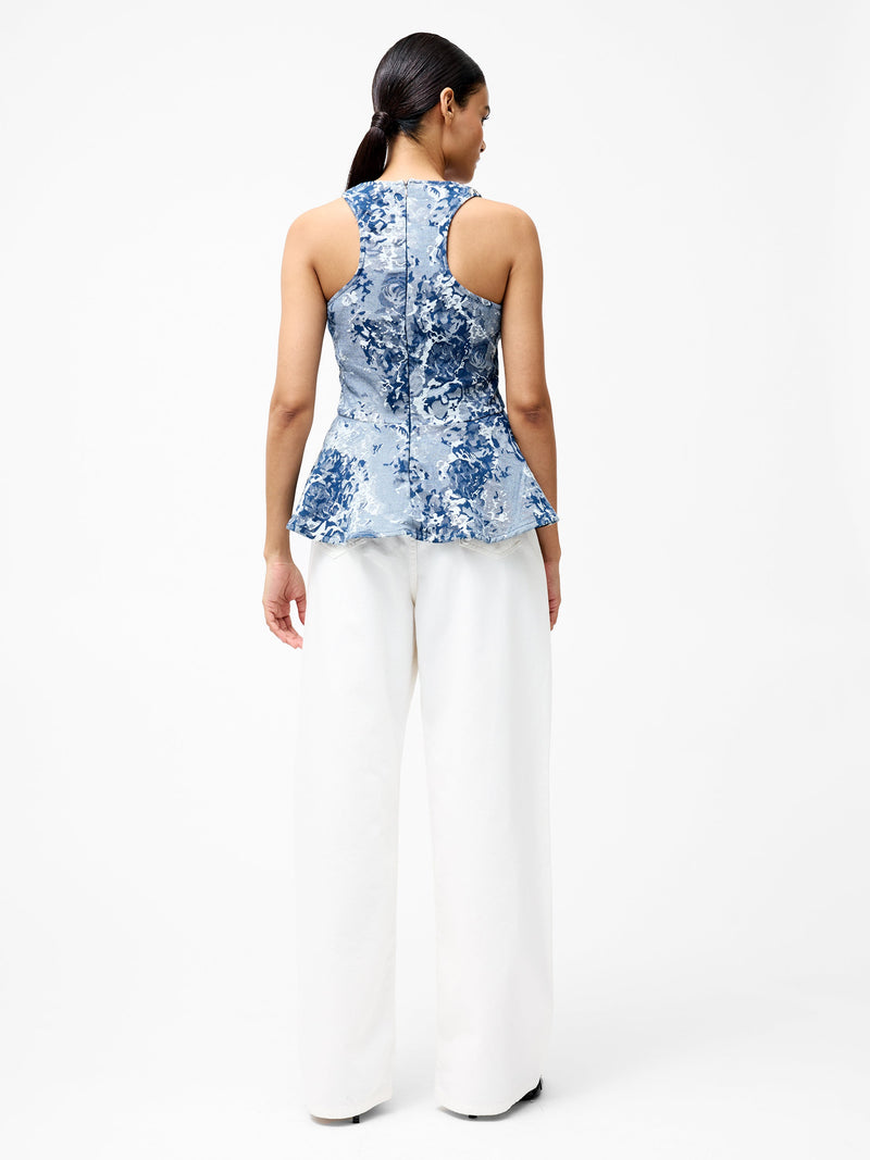 Our Charlotte Denim Jacquard Peplum Top revives reliable denim with a modern yet feminine refresh. This denim top features a crew neckline, racerback design, a floral print and floaty peplum hem.